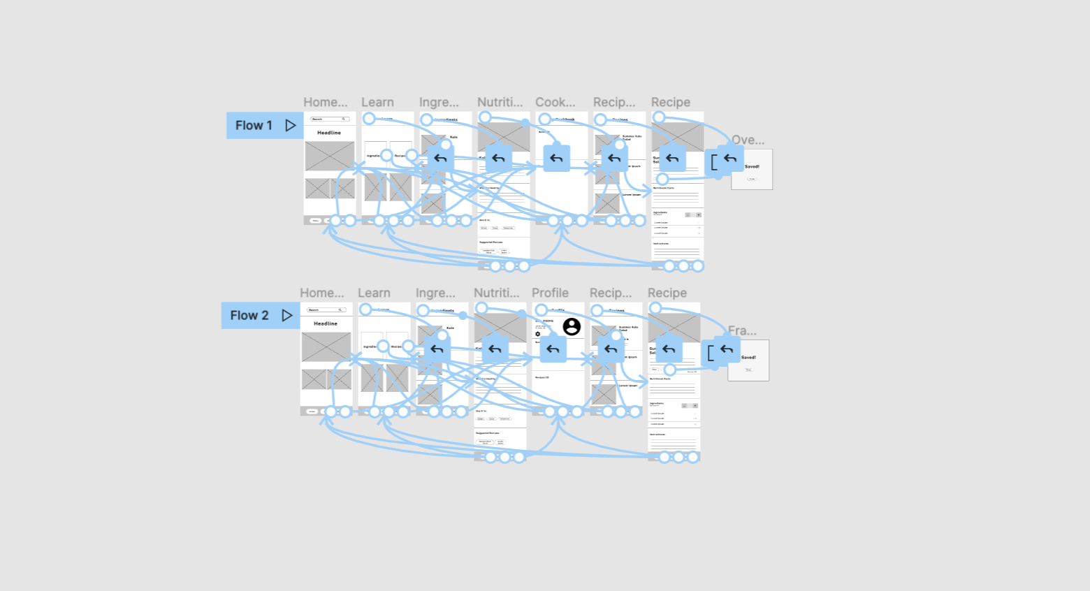 To prepare for the usability test, I created a low fidelity prototype that connected the user flow of searching for an ingredient or recipe and saving it for later.